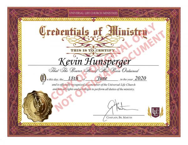 Several years ago I had contemplated becoming an ordained minister. I had a couple of friends who had done it online and thought it would be something cool to do. The ordination allows the certified person to perform marriage ceremonies.
