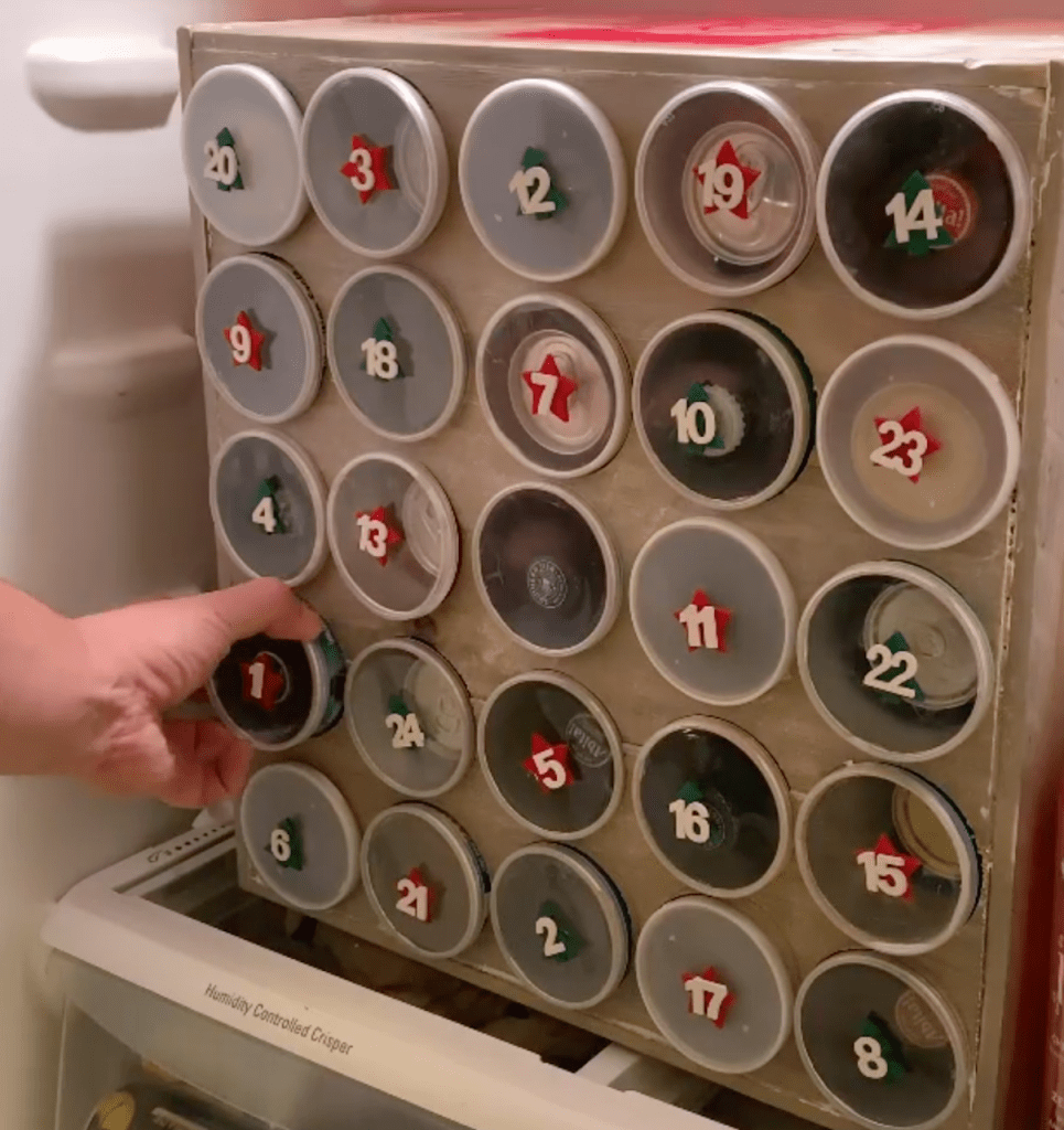 She ended up constructing my friend’s calendar with the cardboard box and wrapping paper idea. We delivered it proudly two days before December 1 to allow it time to get cold in his refrigerator. With a wood kit from Menards, a borrowed nail gun, and a last-minute run to Home Depot for a hole saw cutter drill bit, my wife built a kick-ass calendar for me. Literally, all I did was add the Pringles cans and beer.
