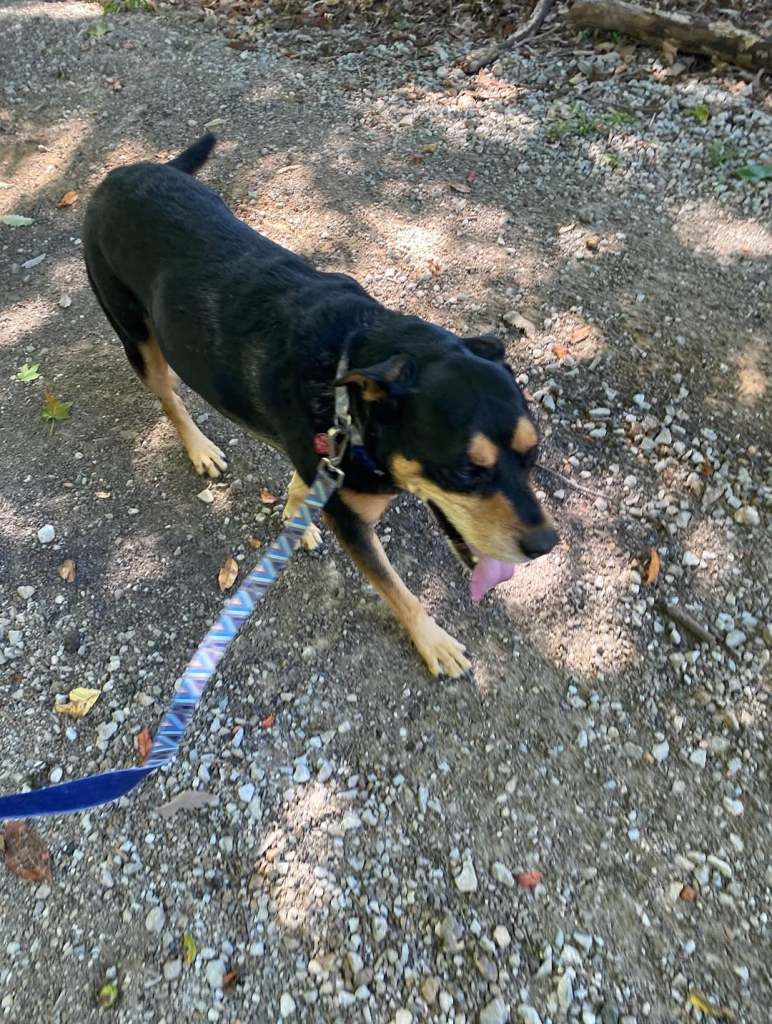 That’s when I turned to social media, asking if anyone had seen our boy. Almost immediately, I received reports that he was at the Family Dollar store, located about two and a half miles from our house. I drove there and got out walking behind the store, where I heard dogs barking. I saw a black dog in the shadows (it was after 8:30 p.m. by this point and dark), but when the dog walked forward, I quickly noted it wasn’t Roscoe, and this guy didn’t look happy.